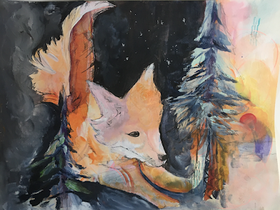These paintings were made during the third installation of my Intuitive Drawing and Painting Livestream Intensive. Viewers worked from images that were compelling to them and used them to make a series of blind contour drawings. Next, they began to extract images from the overlapping blind contours. Some prompts were given such as: paint a stain of any color over 2/3's of the substrate, work with a complementary color set, draw a food from your most recent meal, rotate your canvas, use a new tool, and several others. The intention is to see what shapes and stories emerge while exploring materials and color. (Click on image for better view.) Thank you, brave participants!